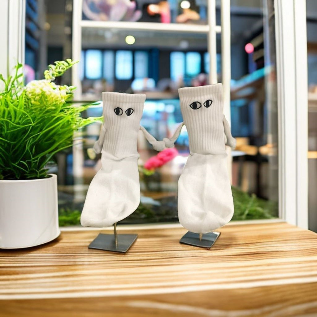 Introducing the delightful Handholding Socks for Couples, an enchanting addition to any wardrobe that brings a touch of whimsy and warmth to your feet. Designed with love and humor in mind, these socks feature unique 3D eyes and charming little hands with built-in magnets, allowing you and a partner to literally "hold hands" with your feet! Perfect for couples, families, friends, or coworkers, these socks are a fun, interactive way to express affection, celebrate togetherness, and spread joy. Crafted with careful attention to detail, each pair is hand-sewn to ensure durability and the secure attachment of the playful eyes. Suitable for men with US size 5-10 and women size 6 and up, these one-size-fits-most socks are as versatile as they are amusing. Whether you're looking for a heartwarming gift for Valentine's Day, Christmas, birthdays, anniversaries, or simply to brighten someone's day, the **Handholding Socks for Couples** serve as a perfect, quirky present that will keep on giving. Remember to hand wash these socks carefully to maintain their unique features and charm. Bring a smile and a handhold to someone special today with these irresistibly funny socks!